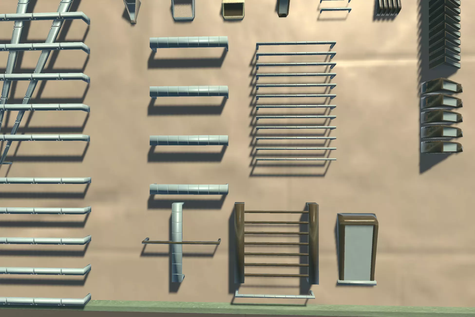 Sci-fi / cyberpunk parts that can snapped onto buildings, floors, walls, ceilingsm or even other props to add details futuristic details that are also performance freidnly. Most of the greebles work great as static or dynaic objects!